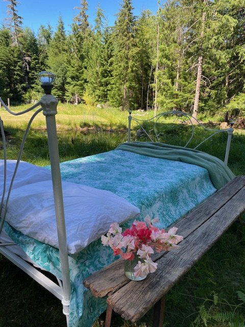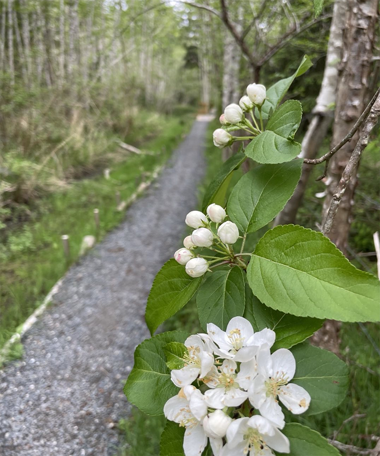 Steps from the cottage, our newest neighbourhood trail—unfolds beneath dappled light and fragrant white crabapple.